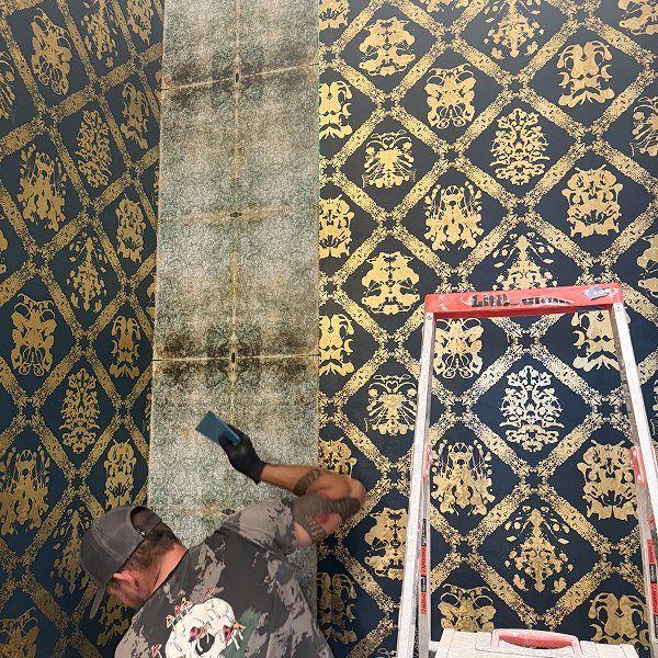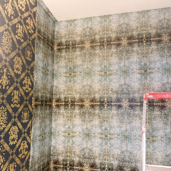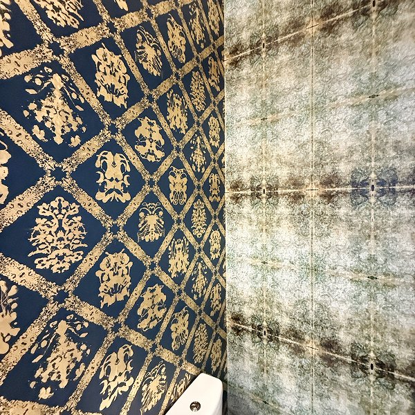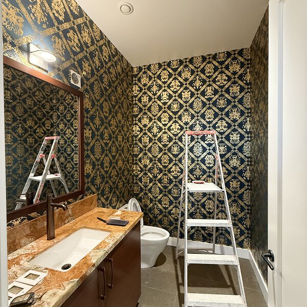 Sophisticated designer pattern featuring complex motifs requiring perfect registration across 10-foot vertical drops in luxury Boulder estate. Intricate design demands meticulous straight match alignment at every seam for seamless visual continuity throughout guest bathroom space. Specialized wallpaper-on-wallpaper technique creates enhanced depth and texture complementing estate's sophisticated architecture. Pattern repeat demands careful panel placement to maintain continuous unbroken flow across 220 square foot guest bathroom with imposing 10-foot ceilings.