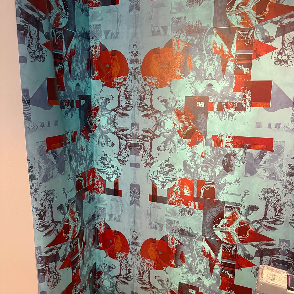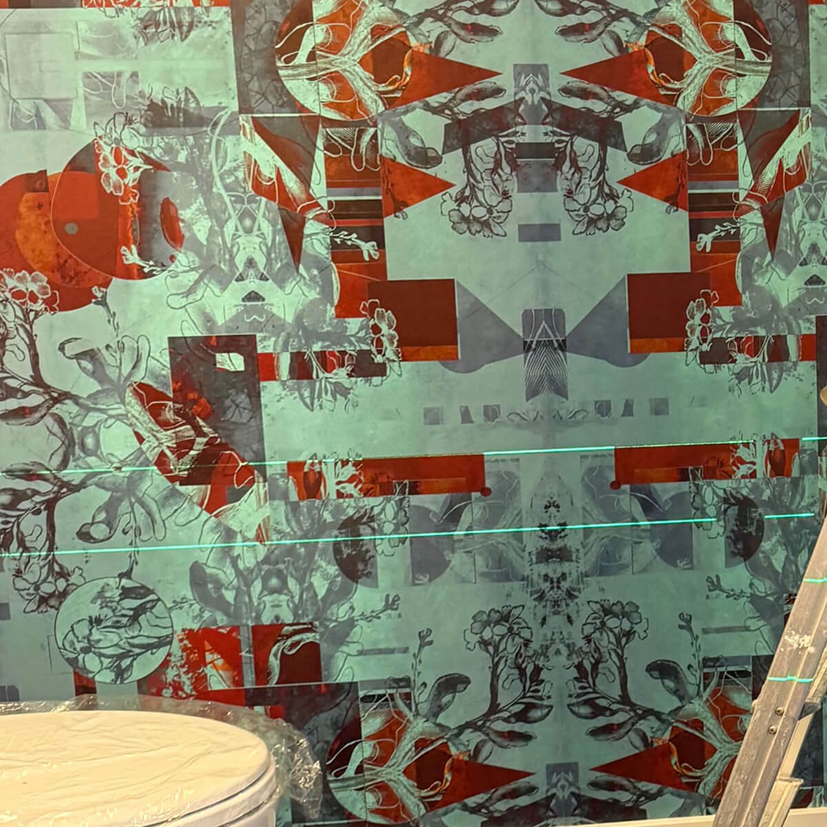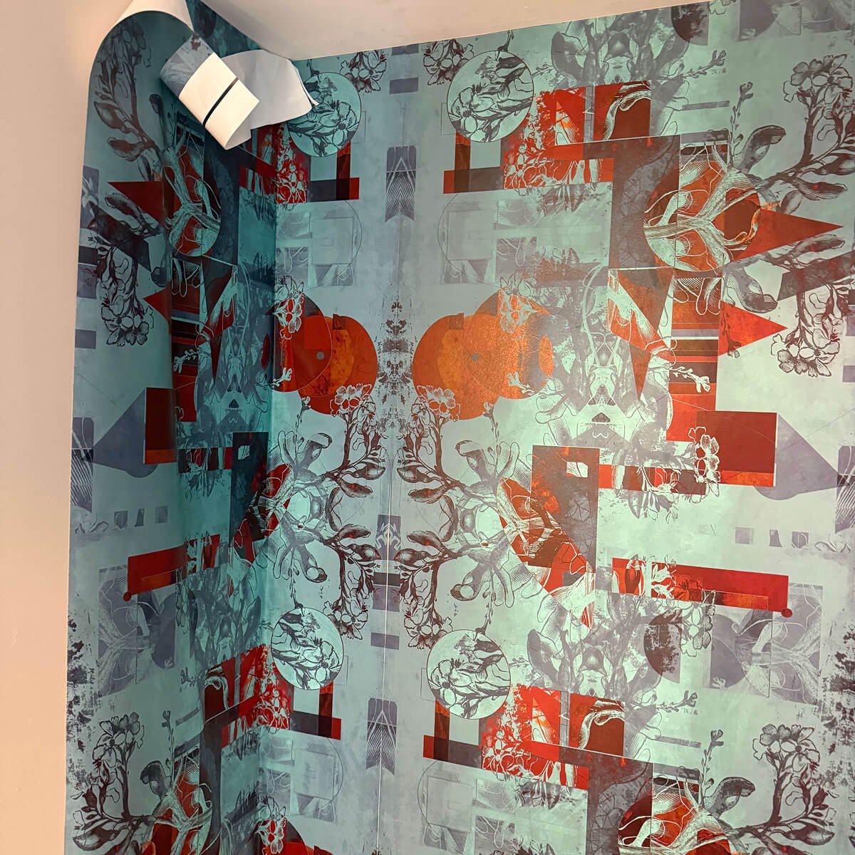 Artistic abstract pattern in turquoise and coral tones with intricate geometric and architectural details. Complex repeat pattern requires center-out installation method for proper symmetry. Pattern features overlapping elements that demand precise alignment across multiple panels and corners.