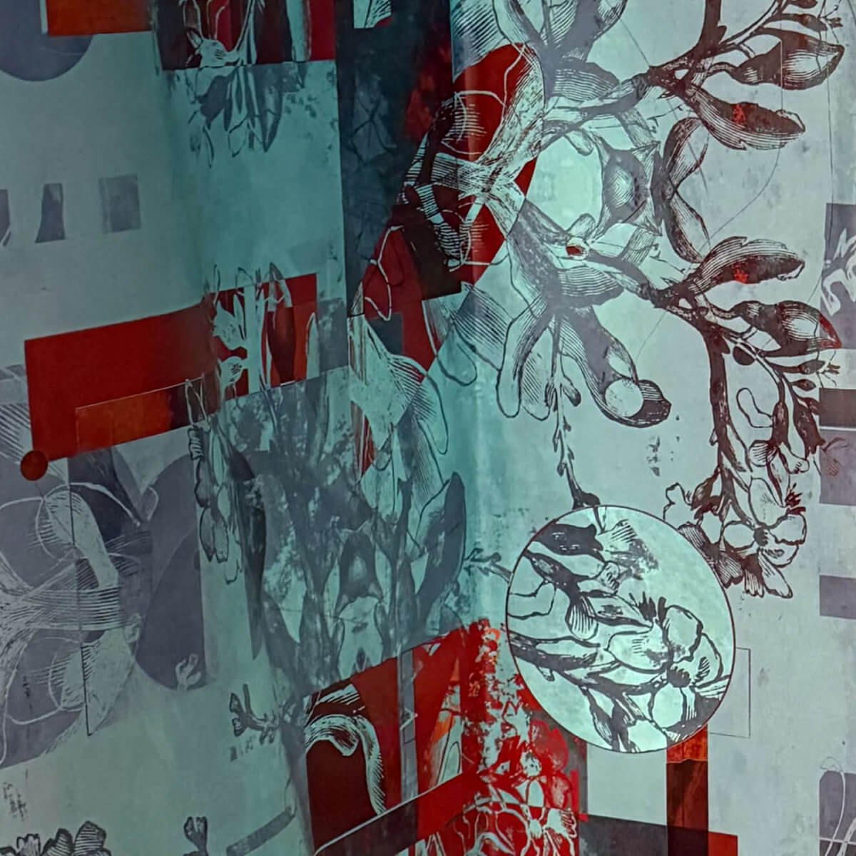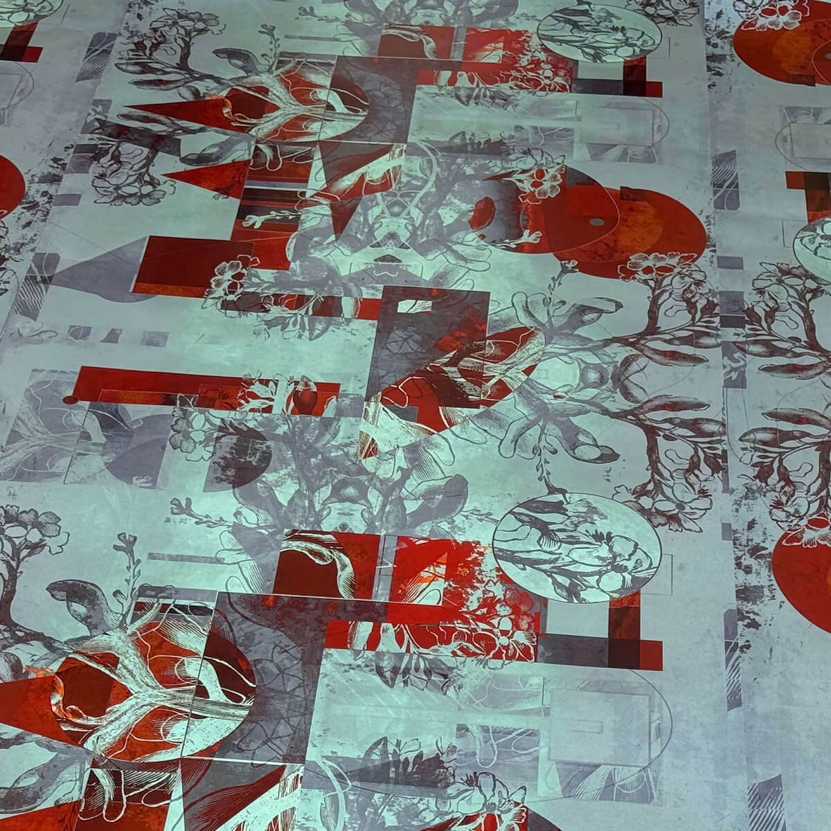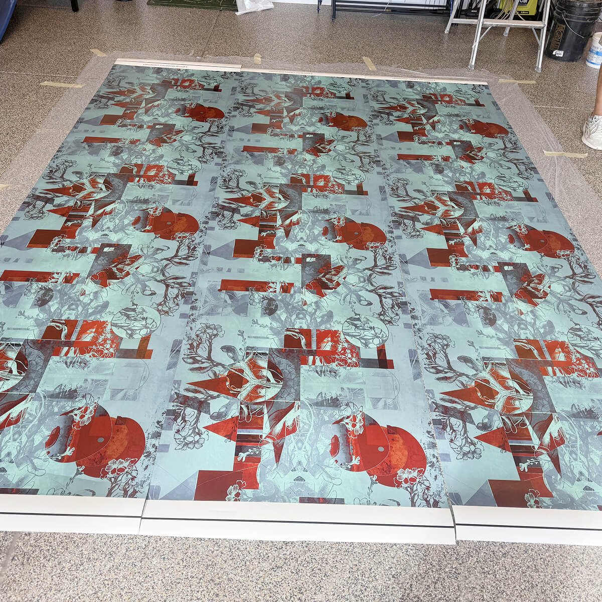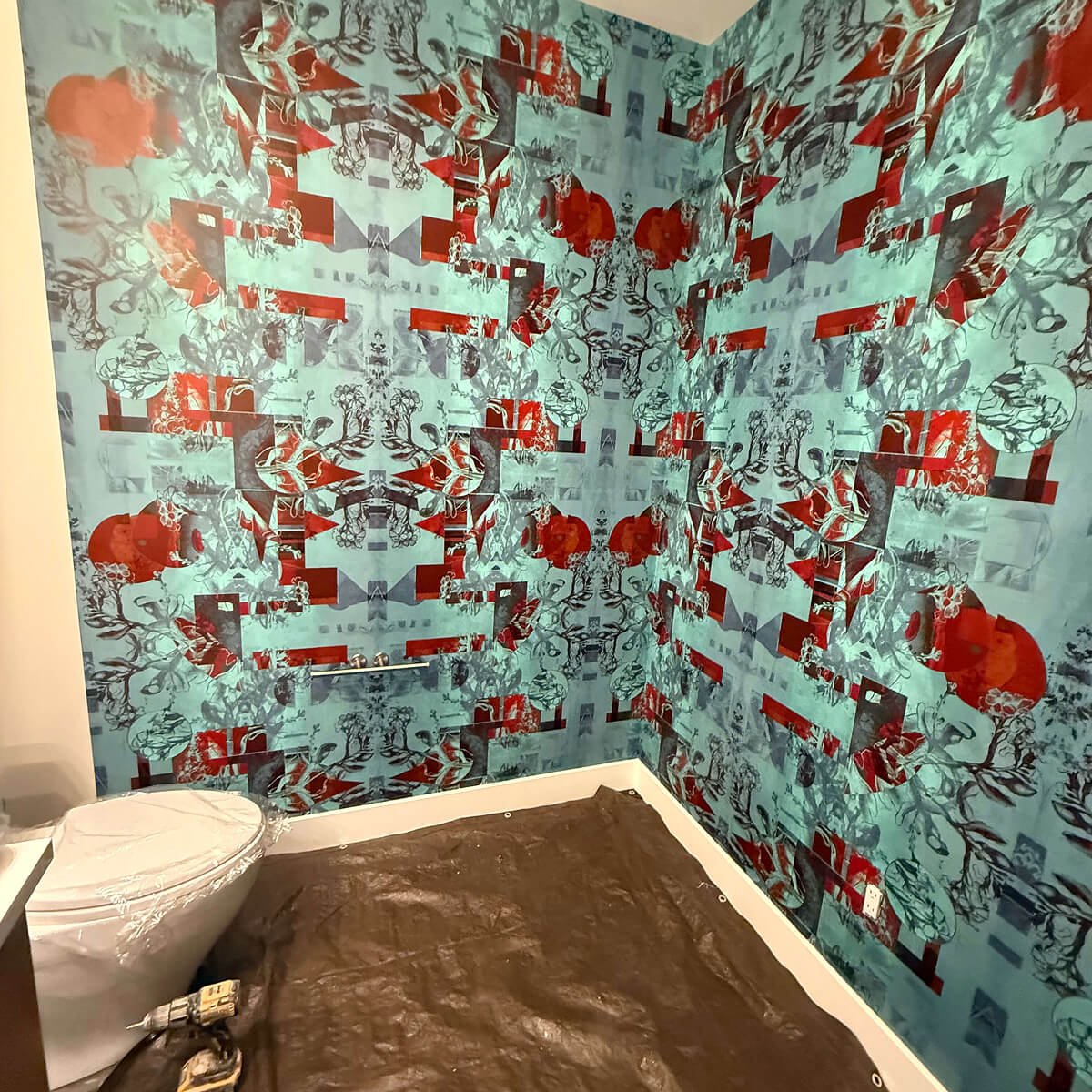 Artistic abstract pattern in turquoise and coral tones with intricate geometric and architectural details. Complex repeat pattern requires center-out installation method for proper symmetry. Pattern features overlapping elements that demand precise alignment across multiple panels and corners.