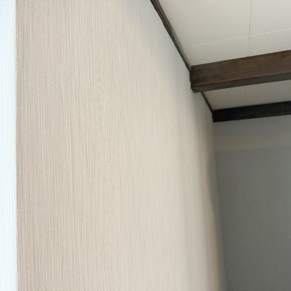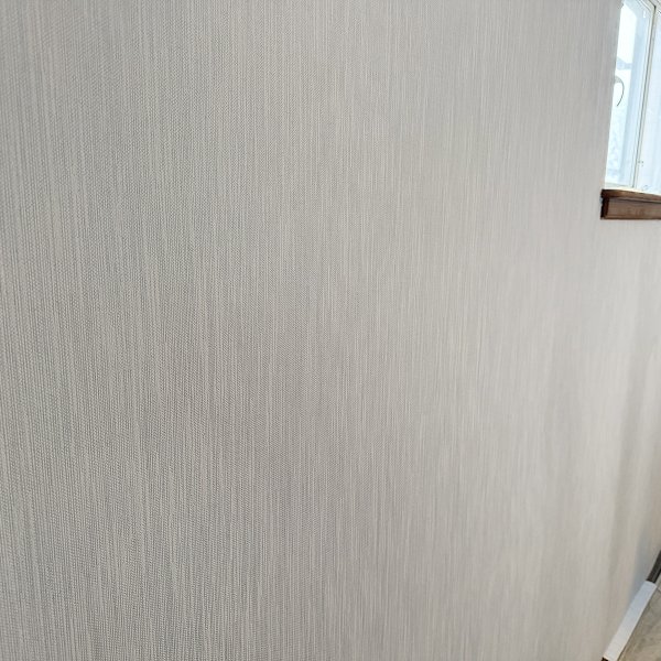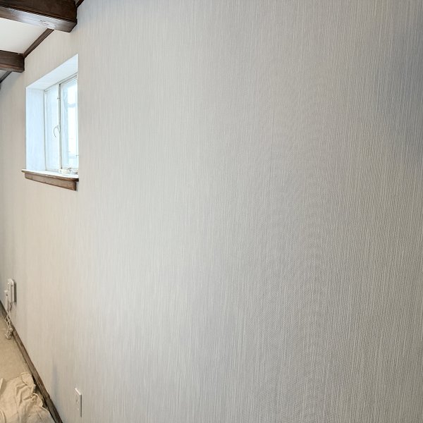Premium vinyl wallcovering with subtle textured finish in light neutral tones. Paste-the-wall application vinyl designed for basement environments requiring moisture-resistant properties. Material selected specifically to brighten below-grade space while providing durable, cleanable surface suitable for high-traffic residential basement use.