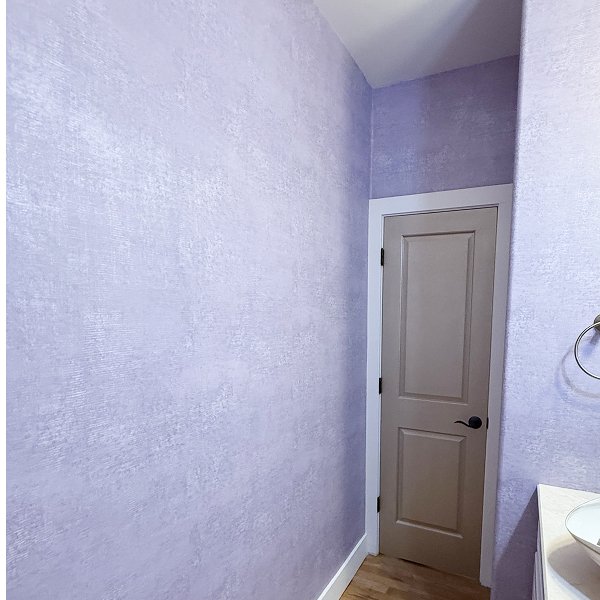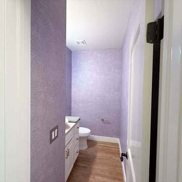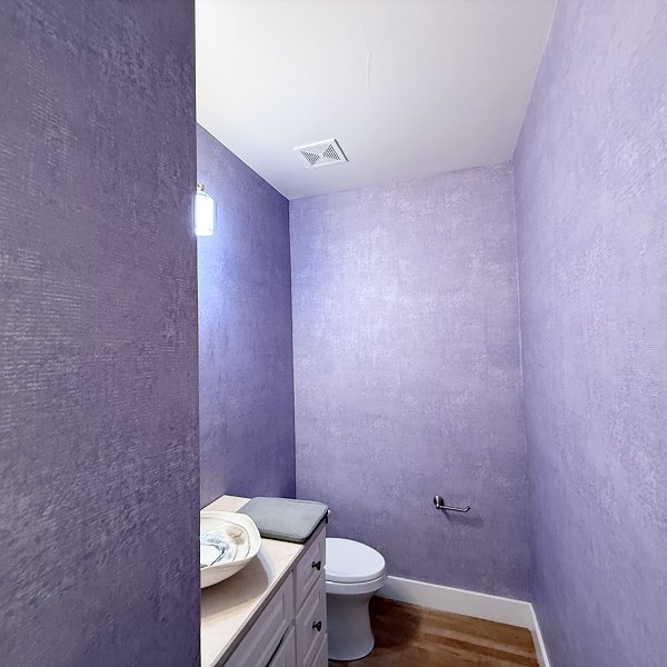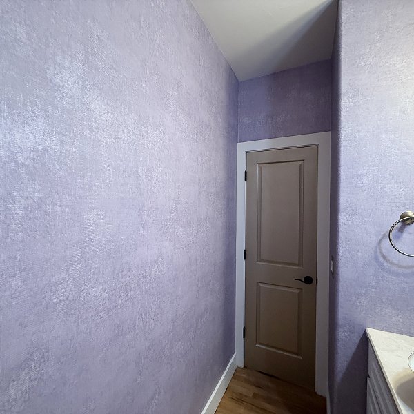 The soft purple color brightened the powder room while creating intimate, elegant atmosphere perfect for a guest bathroom. The velvety texture added dimensional quality that changed with light angles throughout the day. Every corner showed invisible seams. Every trim edge demonstrated precise cutting. The vaulted ceiling angles displayed professional technique handling complex geometries. Modern light fixtures and vanity integrated seamlessly with the wallcovering throughout the space.