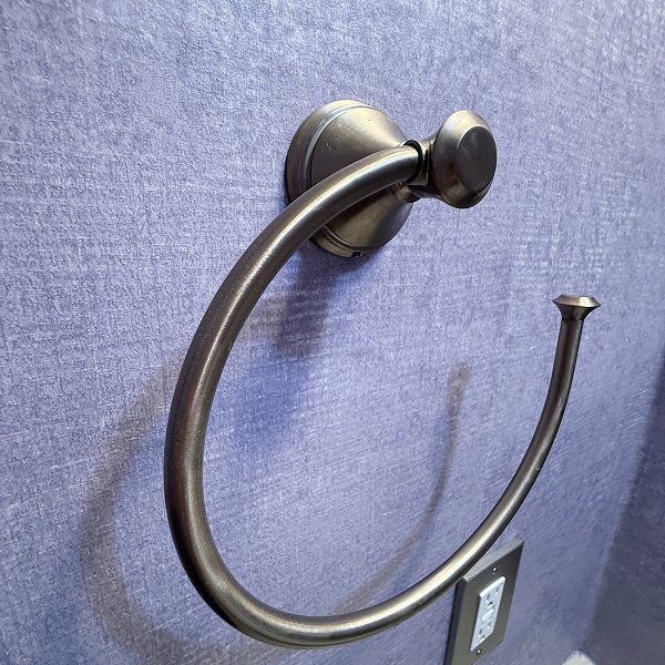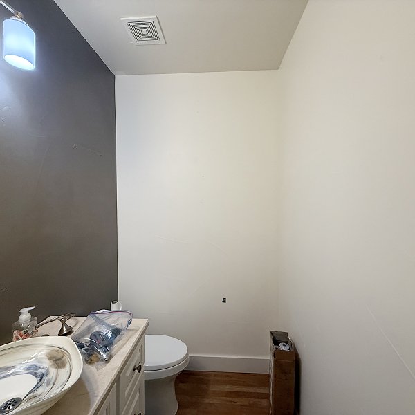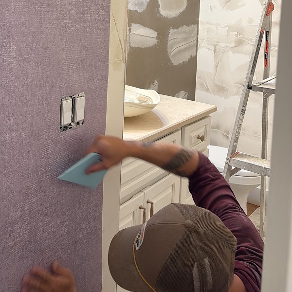 By late afternoon, the Morrison powder room transformation stood complete. The premium Grandeco Belgian wallcovering with its velvety texture in soft purple tones had transformed the guest bathroom from builder-grade standard into sophisticated upscale space. All 194 square feet displayed smooth, professional finish - the comprehensive surface preparation we'd completed earlier now delivered exactly what proper prep work should: walls that look professionally executed, not just papered over existing surfaces.