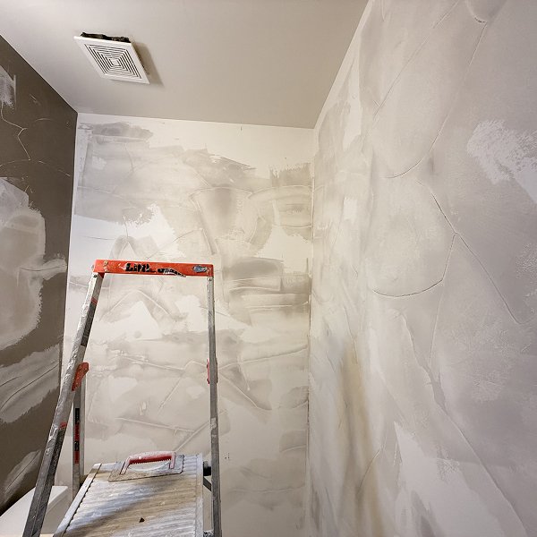 Working in the confined powder room space demanded systematic approach to avoid bumping completed walls or fixtures during final detail work. Every movement was calculated, every tool placement deliberate. The result showed in the finished installation - invisible seams throughout, clean edges around all trim and fixtures, velvety texture preserved perfectly across all 194 square feet. This level of detail work reflects European-trained standards where every visible element receives equal attention to quality.