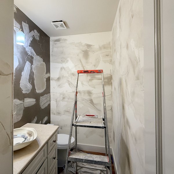 The Morrison powder room started as a typical builder-grade space with standard painted walls throughout. The homeowner envisioned transforming this guest bathroom into something more sophisticated - a space that would impress visitors with premium materials and professional execution. They selected Grandeco wallcovering from Belgium, known for exceptional quality and luxurious velvety textures that create dimensional visual interest.