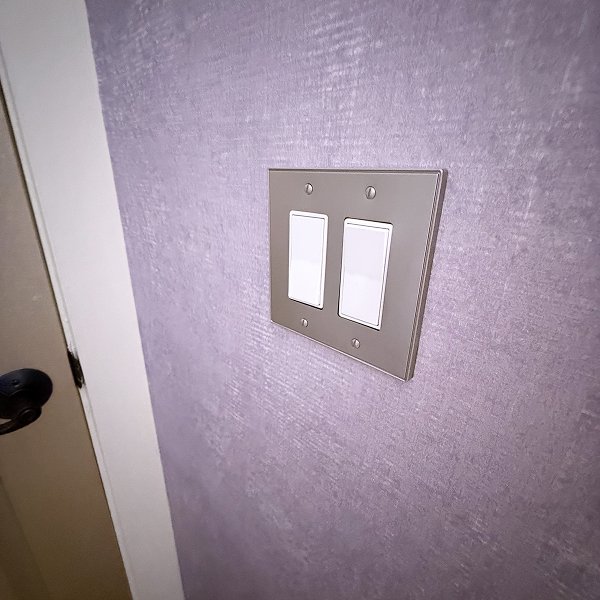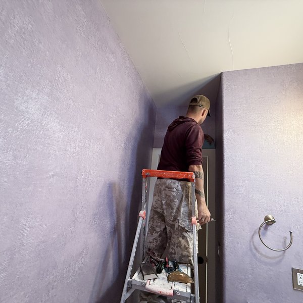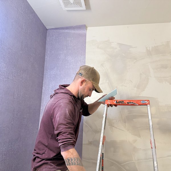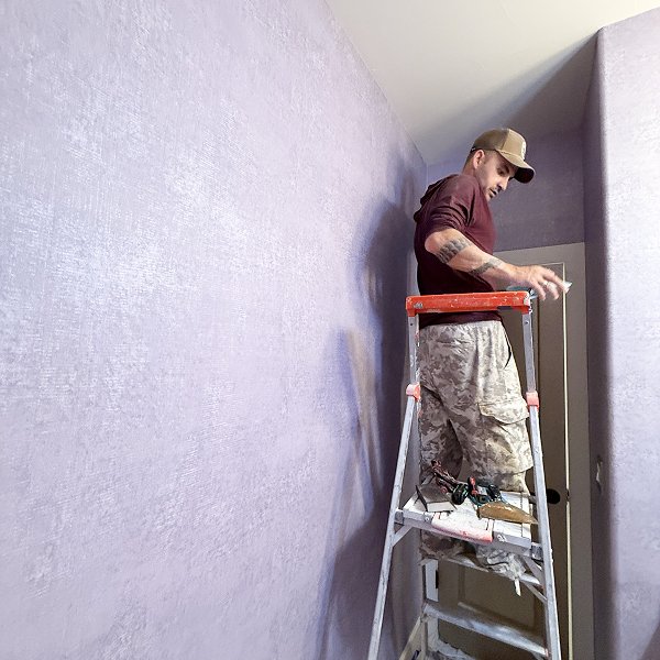 Our two-person crew worked with focused efficiency. One installer handled material preparation and paste application while the other managed panel positioning and smoothing. The soft purple color showed every detail of our earlier preparation work - smooth surfaces meant smooth installation, with no imperfections disrupting the elegant velvety finish. We took just a 10-minute break midday, then continued systematic execution until the transformation was complete.
