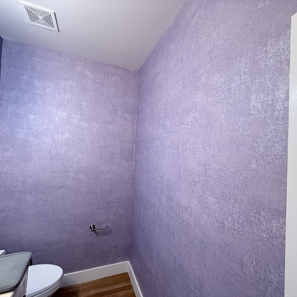 Working as a dedicated two-person crew with just a 10-minute break, we completed all 194 square feet in 7 hours 10 minutes. The Belgian Grandeco wallcovering required gentle handling to preserve the velvety texture throughout installation. The soft purple color displayed beautifully against the white fixtures, creating the upscale ambiance the homeowner envisioned. The client was thrilled with the transformation and posted an extremely positive review on our website, praising the quality of execution, cleanliness throughout the process, and efficient timeline that exceeded their expectations.