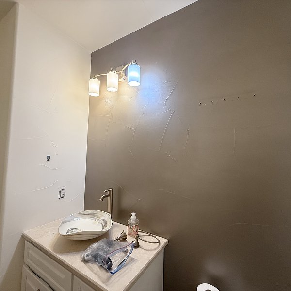 The project demanded comprehensive wall preparation before any wallcovering could be installed. Velvety textured wallpaper reveals every surface imperfection, so we invested time in systematic surface work - spackling all imperfections, sanding smooth, and priming for optimal adhesion. The vaulted ceiling added complexity with angled walls requiring careful pattern flow planning. Modern light fixtures and bathroom elements needed protection and careful work around electrical components.