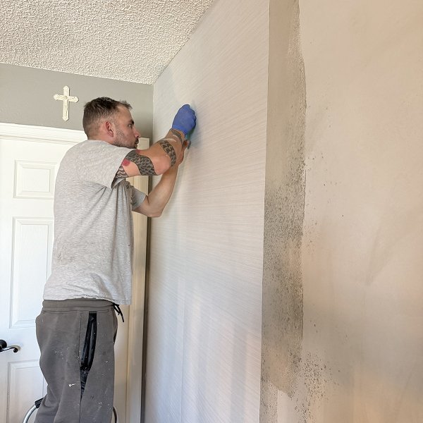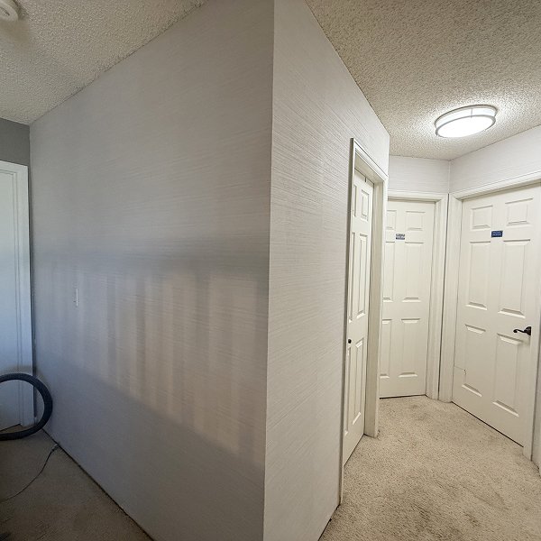 To ensure a flawless finish, we performed a full skim-coat on all walls, effectively eliminating the existing texture and creating a perfectly smooth, mirror-like foundation. We removed all outlet covers, switch plates, and fixtures to guarantee clean edges and professional results. To maintain our strict same-day completion schedule, we utilized industrial air blowers to accelerate the drying of the skim-coat, allowing us to move from preparation to installation without delay.
