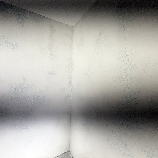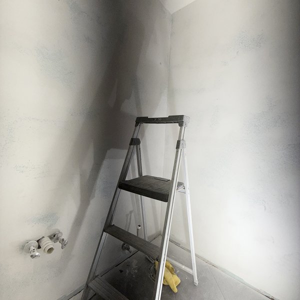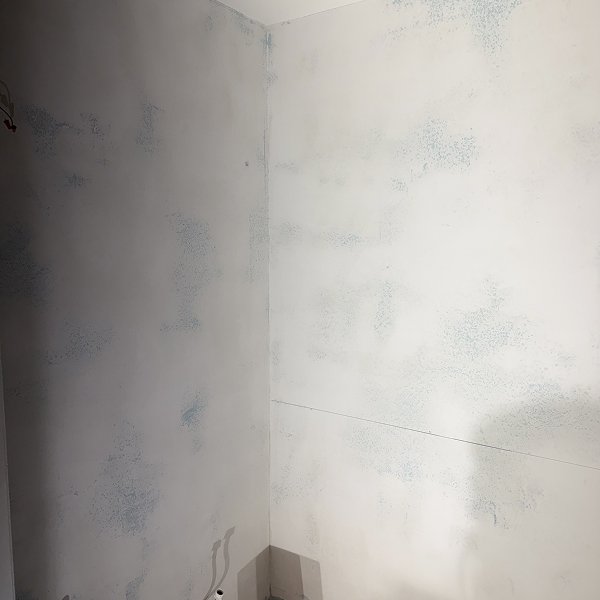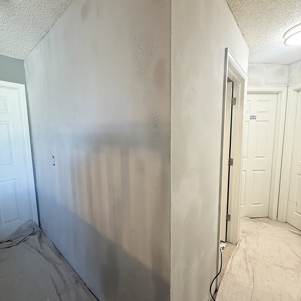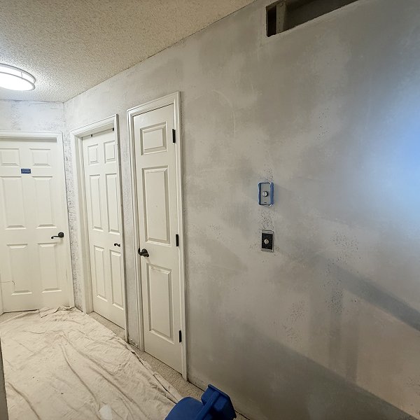 The project demanded extensive preparation work. Upon arrival at 8:00 AM, -our team immediately protected all flooring and fixtures, then performed a full skim coat -on all walls to eliminate existing texture and create a mirror-smooth surface. Using industrial blowers to accelerate the drying process, we were able to transition from preparation to installation in record time.