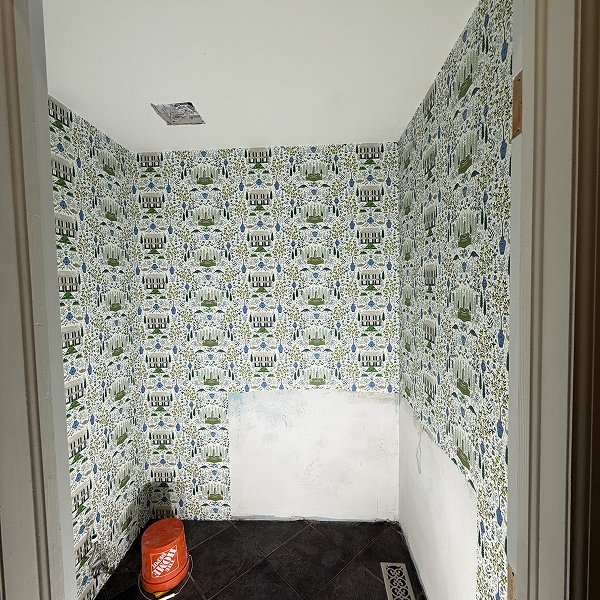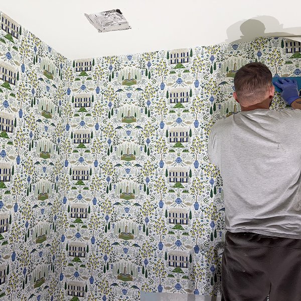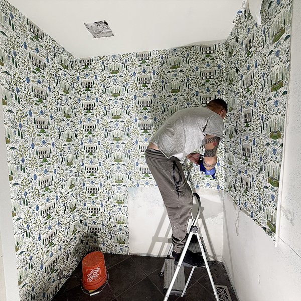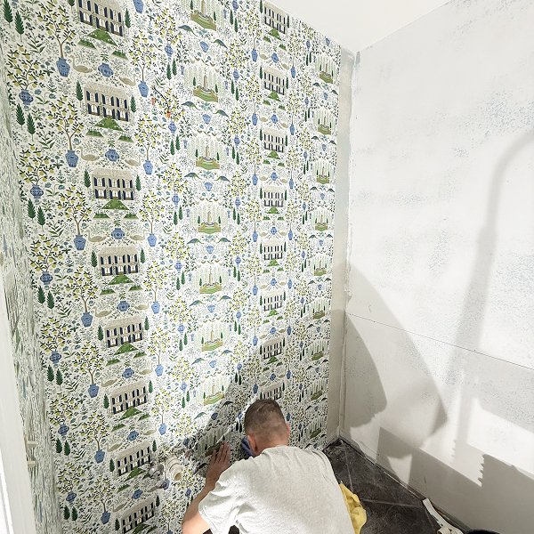 In the powder room, the intricate York Camont pattern required extreme patience and technical precision. We successfully managed tight spaces behind the vanity, mirror, and plumbing fixtures, maintaining the pattern's visual flow without compromise. By utilizing specialized professional tools and our signature cascade method, we achieved 100% pattern registration even in the most difficult-to-reach areas, delivering a flawless luxury aesthetic for this 260 sq ft project.